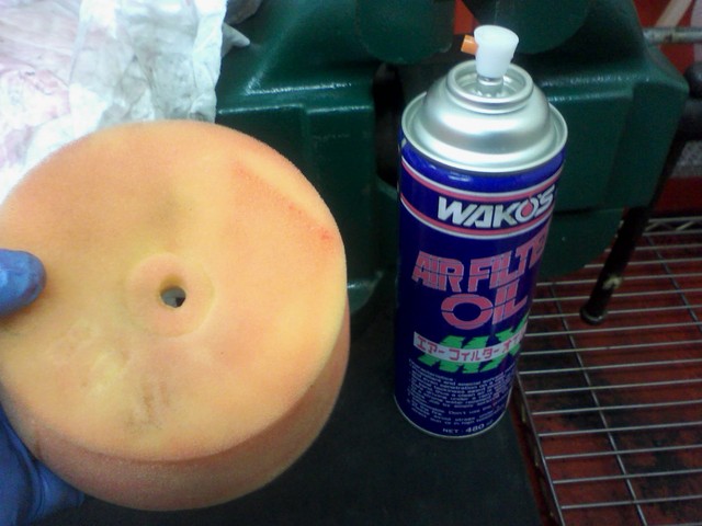 ワコーズ:エアーフィルターOILを、フィルターの表面と内側にまんべんなく吹き付けます